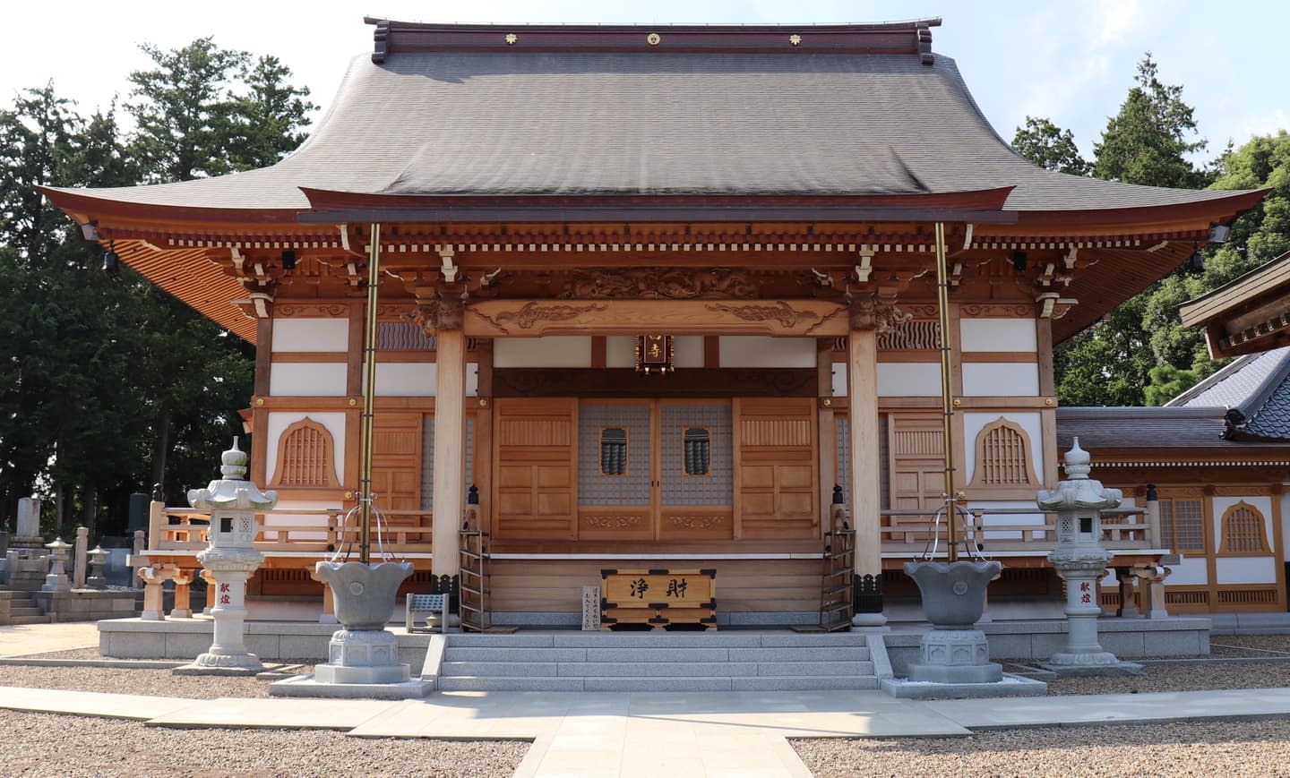浄土真宗西本願寺派の宗教法人です。常磐自動車道「千代田石岡インター」の近くとなります。国道6号線・下土田北交差点を西へ曲がると、案内板が見えてきます。周辺は、田畑が広がるのどかな場所です。