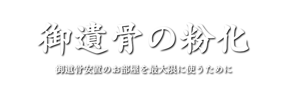 設計の都合上、埋葬するためのお部屋に御遺骨を埋葬する数に限りがあります。大切なお墓です。これまで通り使い続けるために、御遺骨を粉化し、体積を減らすことで、埋葬できる数を増やすことができます。例えば、関東では7寸壷(直径約21cm×高さ約25.5cm)一般的です。しかし粉化すれば5寸壷(直径約15cm×高さ約18cm)に入れ替えることができます。さらに、弊社指定のサテンの納骨袋に入れますと、その体積は小さくできます。